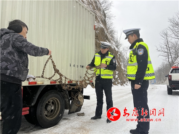 組織廣貨街交警中隊、旬陽壩交警中隊和巡查組民輔警在345國道石溝梁路段及210國道平河梁、月河梁、腸子峽等重點路段流動巡邏檢查。對未掛防滑鏈條的車輛,要求停車掛好防滑鏈條后再上路行駛,對不會安裝防滑鏈條的車主,民警手把手教司機安裝防滑鏈條,并叮囑駕駛人時刻注意冰雪路面行車安全,提高安全行車意識。同時,會同公路部門、鎮村在路面撒鹽融冰,清掃積雪,并要求各鎮勸導站開展交通安全勸導,全力預防道路交通事故發生。