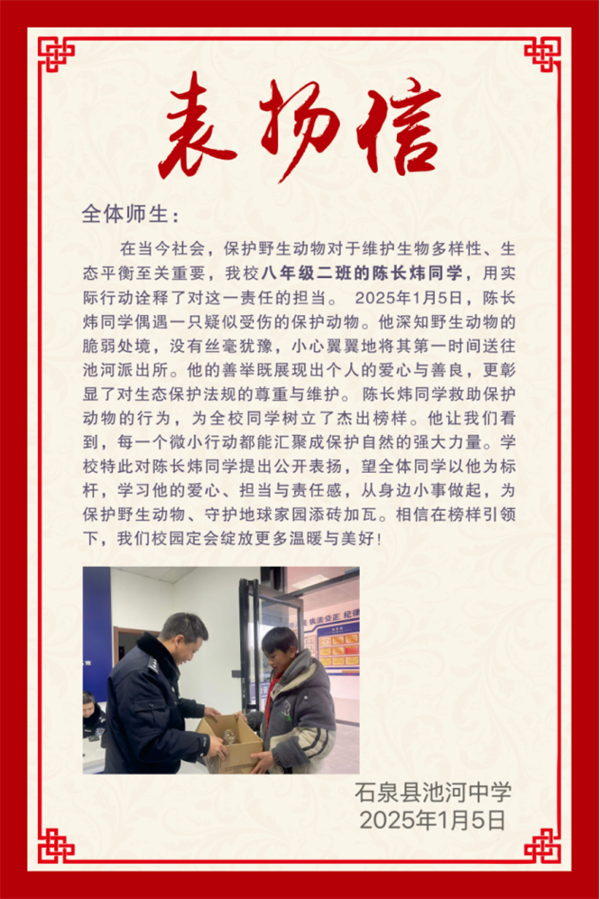 陳長煒的暖心事跡傳到學校后,學校發布了表揚信,公開表揚陳長煒同學的愛心善舉和保護野生動物的暖心行為。號召全體學生要學習陳長煒的愛心、責任和擔當,從小事做起,從自身做起,保護野生動植物,為保護地球家園、尊重生態文明的多樣性貢獻力量。 xUA安康新聞網