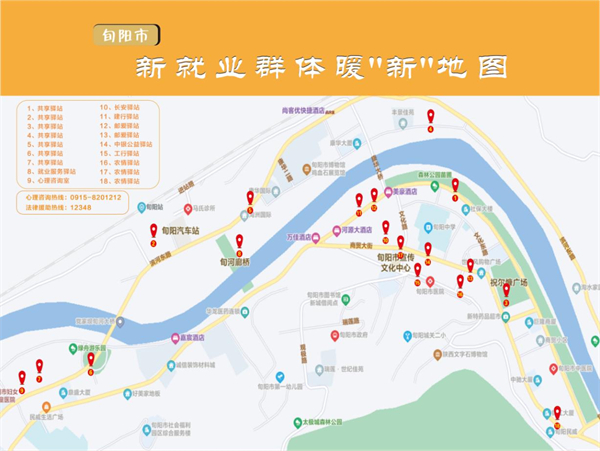 為提升服務(wù)效能,讓更多新就業(yè)群體享受到便捷的暖新服務(wù),旬陽(yáng)市委社會(huì)工作部特別制作了暖“新”地圖,將城區(qū)18處共享驛站具體位置精準(zhǔn)標(biāo)注在地圖上,可一目了然找到距離最近的驛站。此外,暖“新”地圖還提供了旬陽(yáng)心理咨詢熱線和“12348”法律援助熱線,全方位服務(wù)新就業(yè)群體。