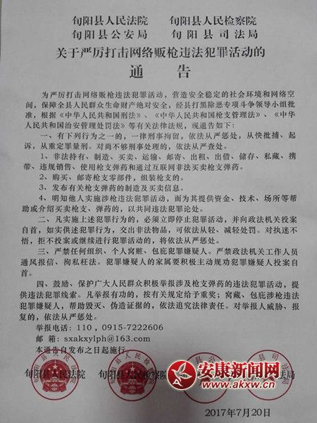 安康新聞網訊(通訊員 祝康)7月20日,旬陽警方聯合法、檢、司部門共同發布了《關于嚴厲打擊網絡販槍違法犯罪活動的通告》。從該縣警方了解到,發布此次《通告》……