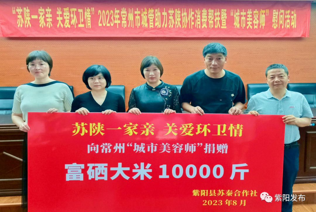 活動上,紫陽縣蘇秦農產品專業合作社向常州市環衛工人捐贈了10000斤紫陽大米作為慰問品,并與10家企事業單位簽訂了消費幫扶產品購銷意向協議。