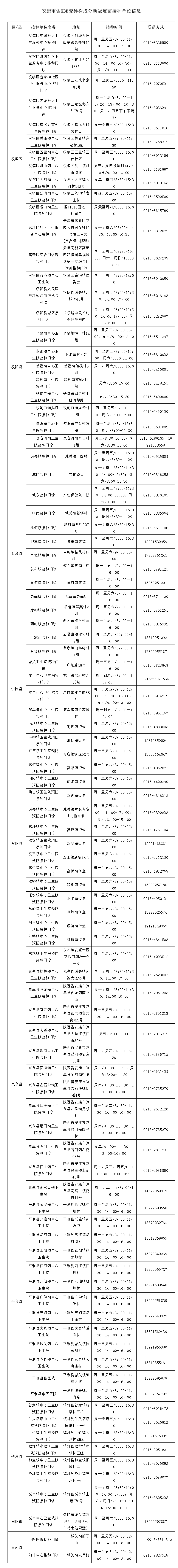 3.目前3價XBB新冠疫苗已送達全市新冠疫苗接種單位,符合接種條件的市民可以咨詢相關接種單位,全市XBB新冠疫苗接種單位信息如下:DwD安康新聞網