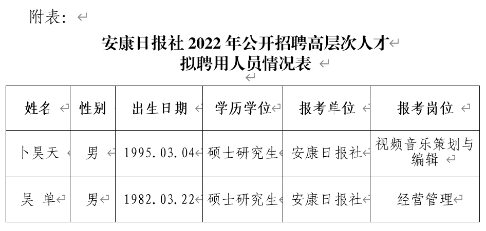 根據(jù)《安康日報社2022年公開招聘高層次人才公告》規(guī)定,經(jīng)報名、資格審查、面試、體檢、考察等程序,現(xiàn)將擬聘用人員(見附表)予以公示。公示期5個工作日,公示時間:2022年12月5日起到2022年12月9日止。