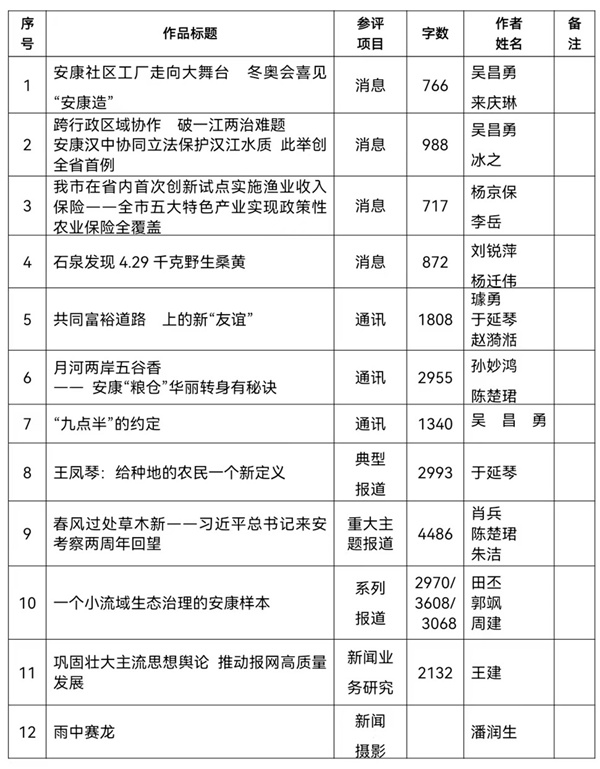 按照省記協(xié)要求,特將推薦參評2022年度陜西新聞獎初評的作品予以公示。公示期為2023年2月13日至2月17日,在此期間內(nèi)如有異議請向新聞管理部反饋。報送作品如下: GGz安康新聞網(wǎng)