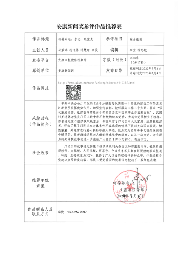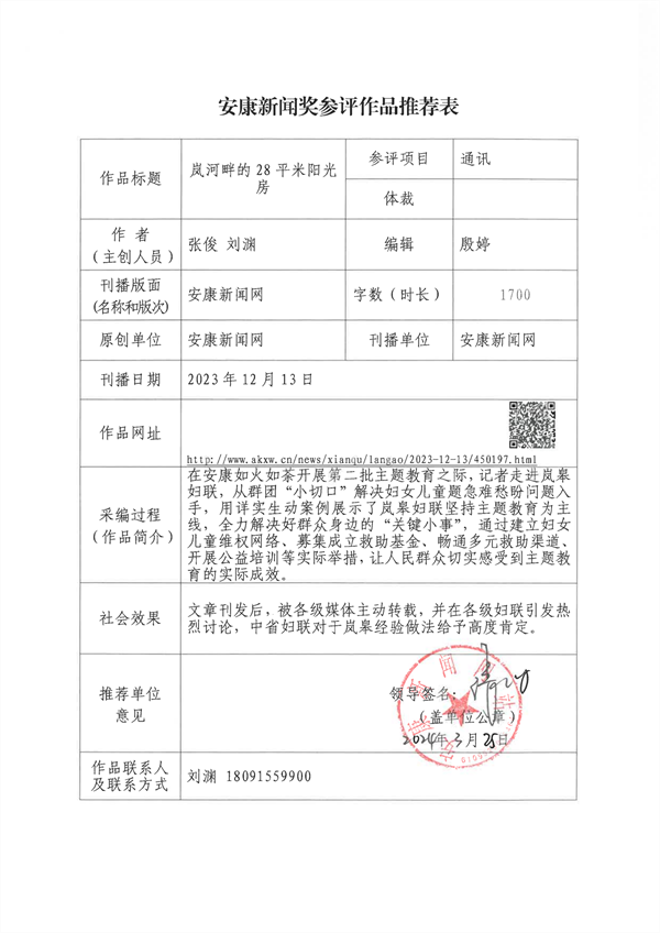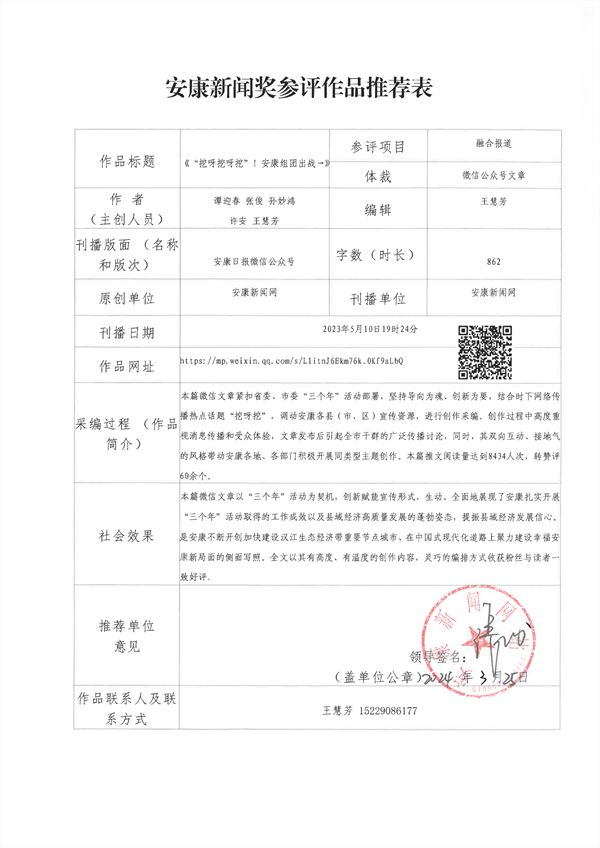 經過編委會推薦、社黨委研究決定,擬推薦以下13件新聞作品參評2023年度“安康新聞獎”。公示時間從2024年3月25日至2024年3月29日,公示期為5個工作日。如有不同意見,請向安康日報社機關紀委、新聞管理部反映。nyB安康新聞網