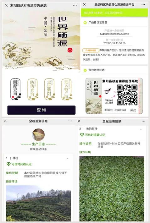 紫陽縣建立了紫陽茶溯源系統(tǒng),利用區(qū)塊鏈、一品一碼等技術(shù),為紫陽茶制作獨一無二的溯源檔案,生成唯一的溯源二維碼,通過手機掃描產(chǎn)品包裝上的二維碼,即可快速通過圖片、實時監(jiān)控視頻等方式,查看紫陽茶從茶園、生產(chǎn)加工、檢測等全程溯源檔案信息。