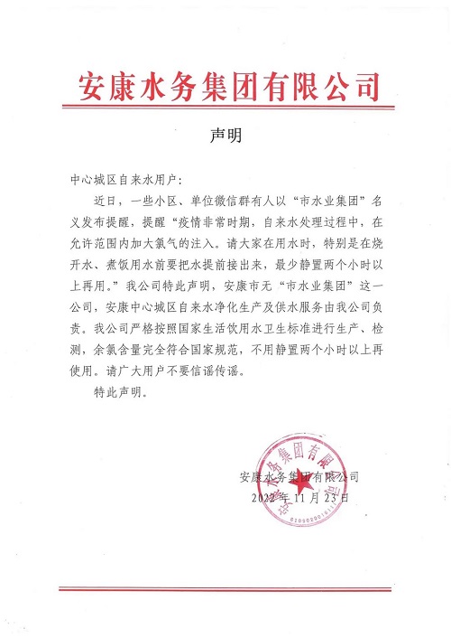 近日,一些小區、單位微信群有人以“市水業集團”名義發布提醒,提醒“疫情非常時期,自來水處理過程中,在允許范圍內加大氯氣的注入。請大家在用水時,特別是在燒開水、煮飯用水前要把水提前接出來,最少靜置兩個小時以上再用。”我公司特此聲明,安康市無“市水業集團”這一公司,安康中心城區自來水凈化生產及供水服務由我公司負責。我公司嚴格按照國家生活飲用水衛生標準進行生產、檢測,余氯含量完全符合國家規范,不用靜置兩個小時以上再使用。請廣大用戶不要信謠傳謠。