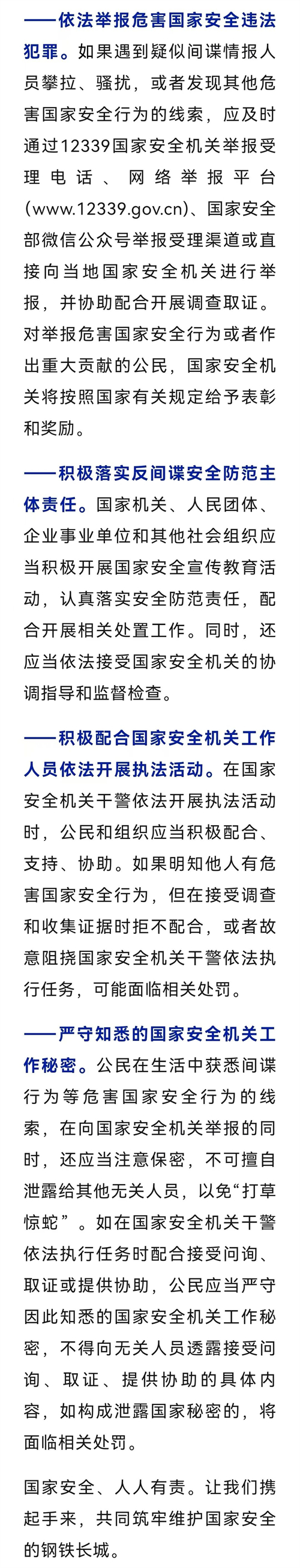 詳情:近年來,國家安全機關在人民群眾支持配合下,有力開展各項工作,堅決維護國家主權、安全、發展利益。《中華人民共和國反間諜法》和《國家安全機關行政執法程序規定》、《國家安全機關辦理刑事案件程序規定》等法律法規規章為人民群眾配合協助開展國家安全機關工作、共同維護國家安全提供了法律依據。(來源:“國家安全部”微信公眾號)