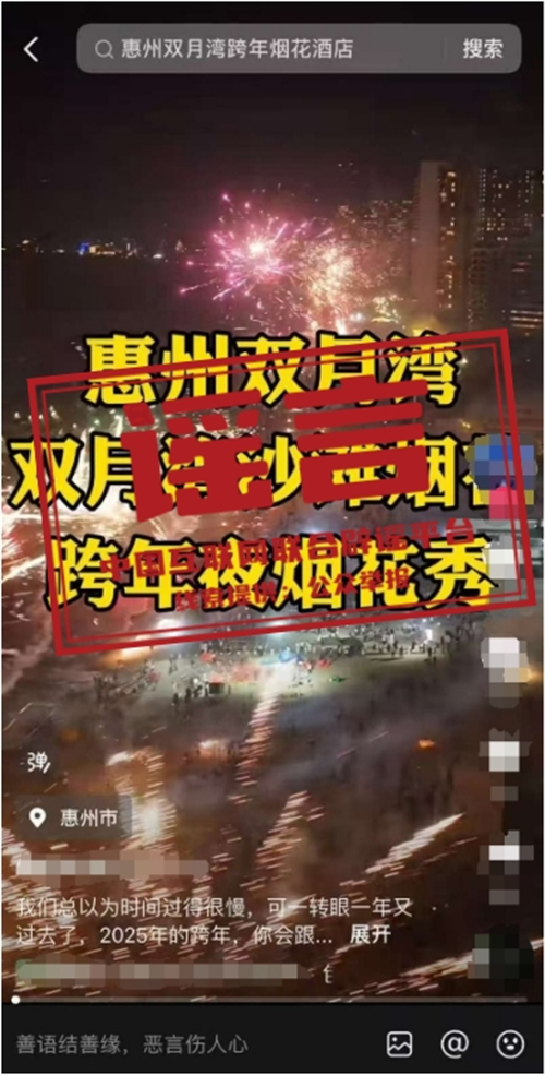 真相:近期,網絡上出現 “廣東惠州雙月灣2025跨年煙花秀”“2025雙月灣跨年倒數夜”“雙月灣跨年煙花秀”等信息,引發關注。經相關部門核實,網傳信息均系不實信息。目前廣東省惠州市惠東縣雙月灣沒有舉辦2025年跨年煙花秀活動的安排,請廣大游客不聽謠、不信謠、不傳謠,一切以官方發布信息為準。(來源:“惠州日報”微信公眾號、惠東文旅體)