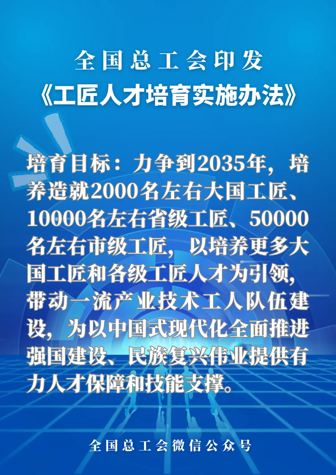 第二條 培育目標(biāo)是,力爭到2035年,培養(yǎng)造就2000名左右大國工匠、10000名左右省級工匠、50000名左右市級工匠,以培養(yǎng)更多大國工匠和各級工匠人才為引領(lǐng),帶動一流產(chǎn)業(yè)技術(shù)工人隊(duì)伍建設(shè),為以中國式現(xiàn)代化全面推進(jìn)強(qiáng)國建設(shè)、民族復(fù)興偉業(yè)提供有力人才保障和技能支撐。