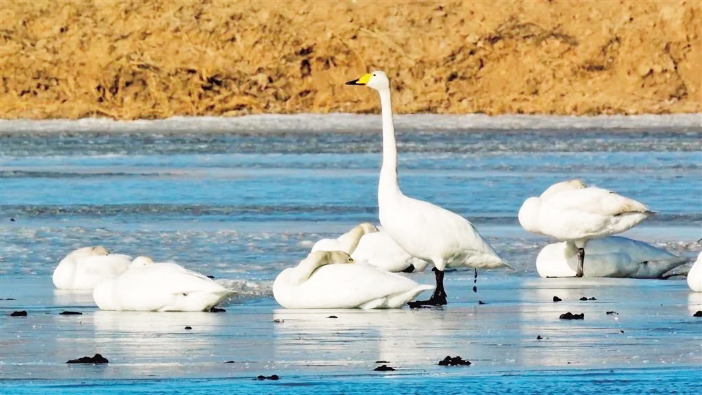 大天鵝又稱黃嘴天鵝。通體雪白色,僅頭稍沾棕黃色,虹膜暗褐色。喙黑色,上喙基部黃色,喙端黑色,喙基部粉紅色,跗跖、蹼、爪也為黑色。幼鳥全身灰褐色,頭和頸部較暗,下體、尾和飛羽較淡。雌雄同色,雌性體型略小,是世界上飛得最高的鳥類之一。(來源:安康市林學會)tEd安康新聞網