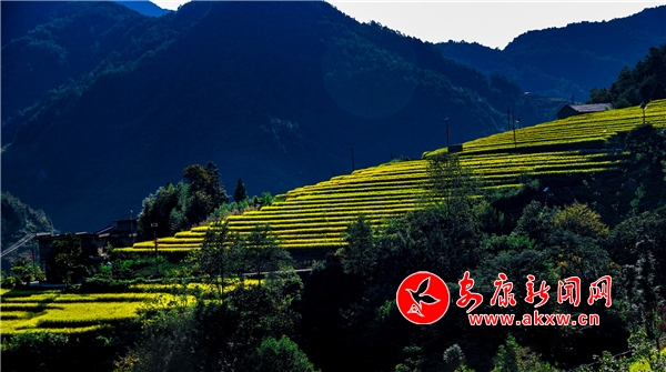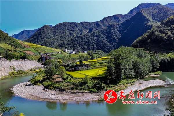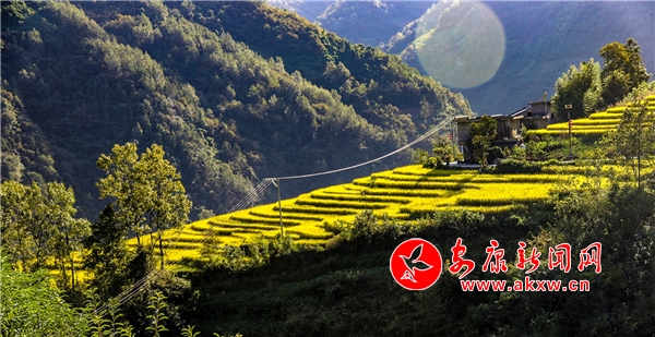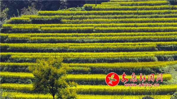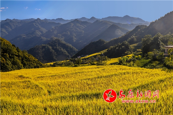 放眼望去,黃亮亮的稻谷,層層疊疊,從山底一直鋪到半山腰。水田都是依山而修,隨山形而變,高差均是隨坡放緩,形狀雖不十分規則卻也精巧,動人之處全在自然的水平線上。rnS安康新聞網