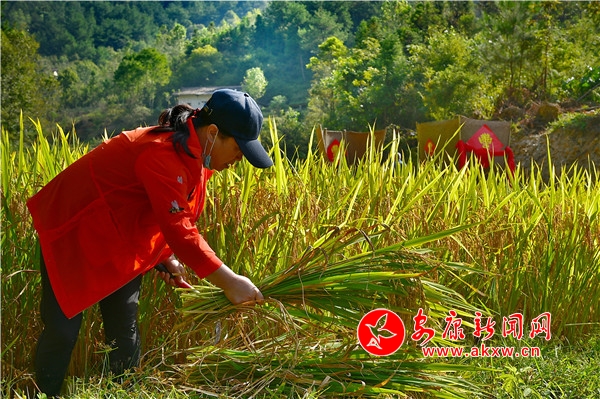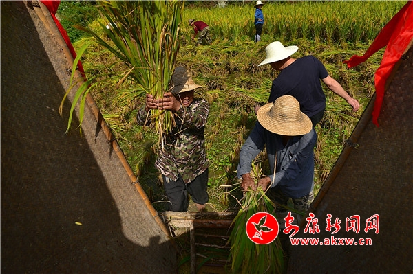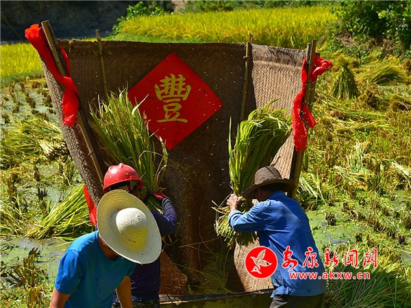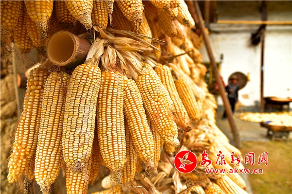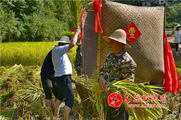 秋日,平利鄉村田園間梯田層層,稻浪滾滾,飽滿的谷穗壓彎了稻桿,放眼望去,遍野鋪金,空氣中也彌漫著淡淡的稻香。在西河鎮女媧山村三里溝原生態水稻田里,人們按照傳統的習俗和方式收割水稻,數十位村民手持鐮刀一字排開,迅速揮舞著手中的鐮刀,將金黃的稻穗割下并整齊的堆放。打谷人則分為兩組,兩人一組,交叉替換的將手中的稻秧在拌桶里反復甩打脫粒,拌谷聲“嘭呲嘭呲”有節奏地作響,聲勢頗為壯觀。與此同時,廣佛鎮松河村李家坡的農家小院已堆滿收回來的苞谷,郭老漢正在將苞谷殼撕開,編成串掛在屋檐下的竹竿上晾曬,金黃的苞谷棒子整齊排列,儼然一幅鄉村小院秋實圖。