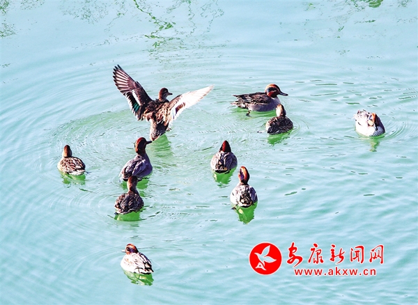 通過攝影鏡頭觀察發現,在大片野鴨群中有綠頭鴨、斑嘴鴨、赤麻鴨等數10個種類。它們在這里和諧相處,像一個個小精靈悠閑自得。一群群野鴨在河里時而相互追逐,時而潛水覓食,一會兒游上岸邊休息,一會兒展翅飛翔劃過湛藍的天空,一幅人與自然和諧共生的美麗畫卷在石泉徐徐展開。