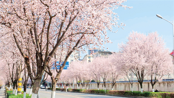 漢陰縣長樂路紫葉李花盛開 劉東 攝ACQ安康新聞網