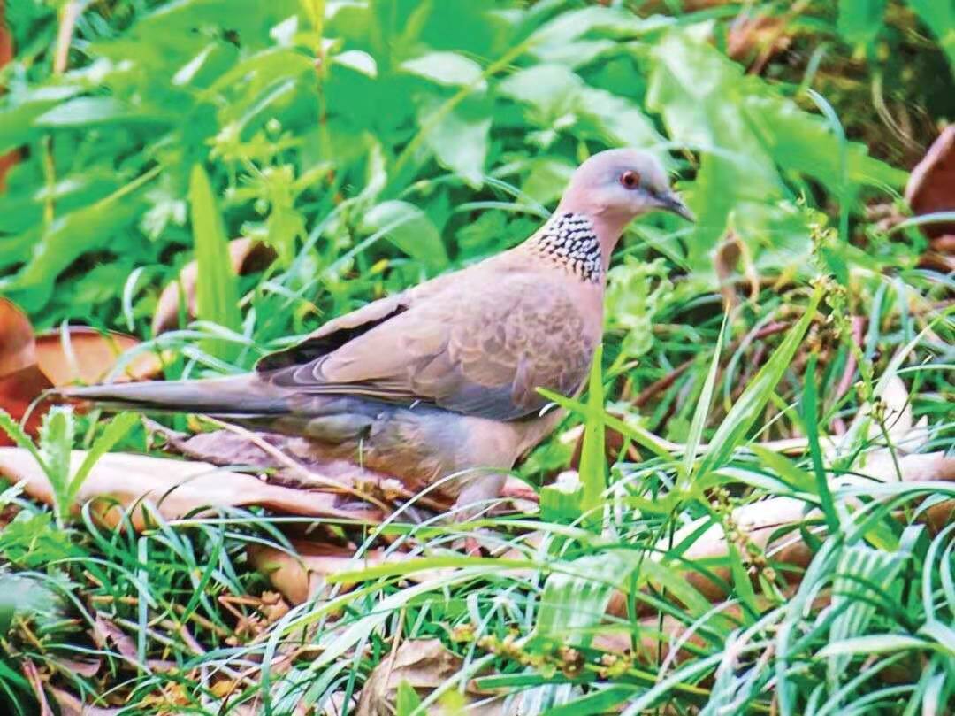 珠頸斑鳩也是很少到地面上來,只有無人時(shí),會笨拙地飛到在地面上叨食。它們常藏在樹枝間,看不到身影,但會發(fā)出“咕咕”的聲音,表明自己的存在。