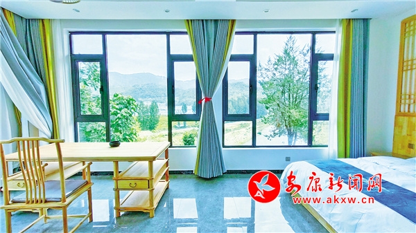 半山腰的獨棟別墅白墻黑瓦,飛檐峭壁,處處滲透著平淡質樸的古典韻味。徽派建筑背倚青山,面朝峽谷,壩河水在谷間緩緩流淌。別墅里每一間都布置得精致高端,站在二樓落地窗前,觀連綿青山,賞花鳥飛禽,讓人陡然間心靜如水。