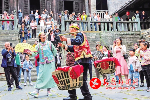 5月1日,旬陽市蜀河古鎮展示傳統民俗文化引來游人喝彩。李春江 攝G6E安康新聞網