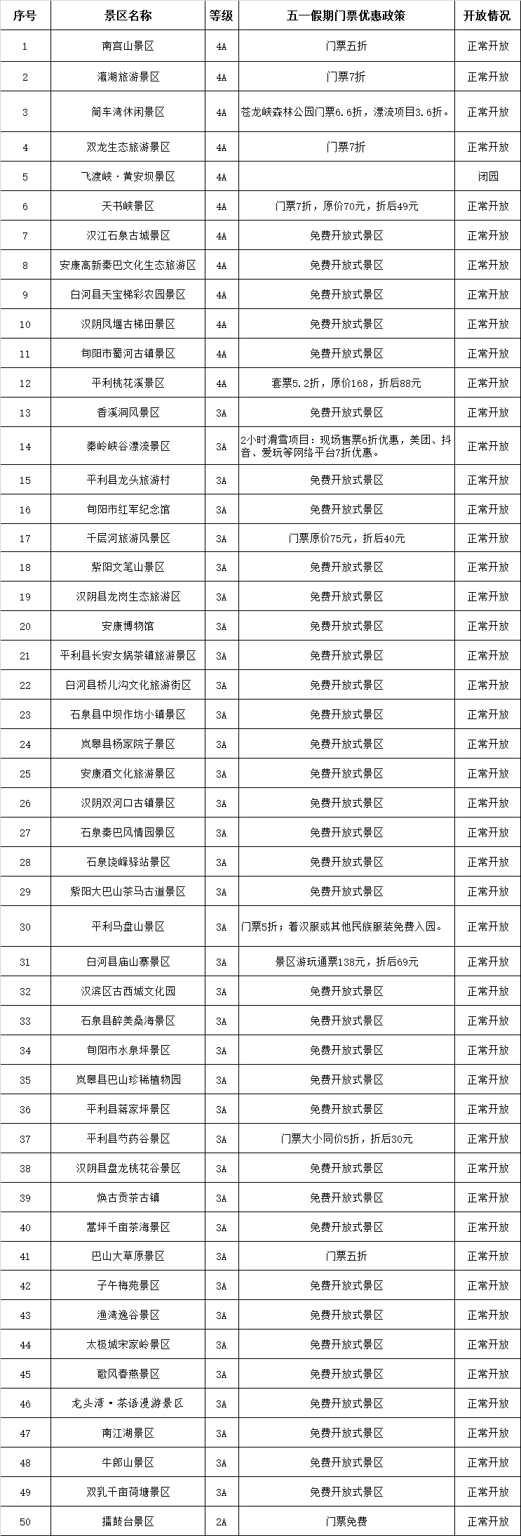 安康市2024年“五一”假日A級旅游景區門票優惠及開放情況