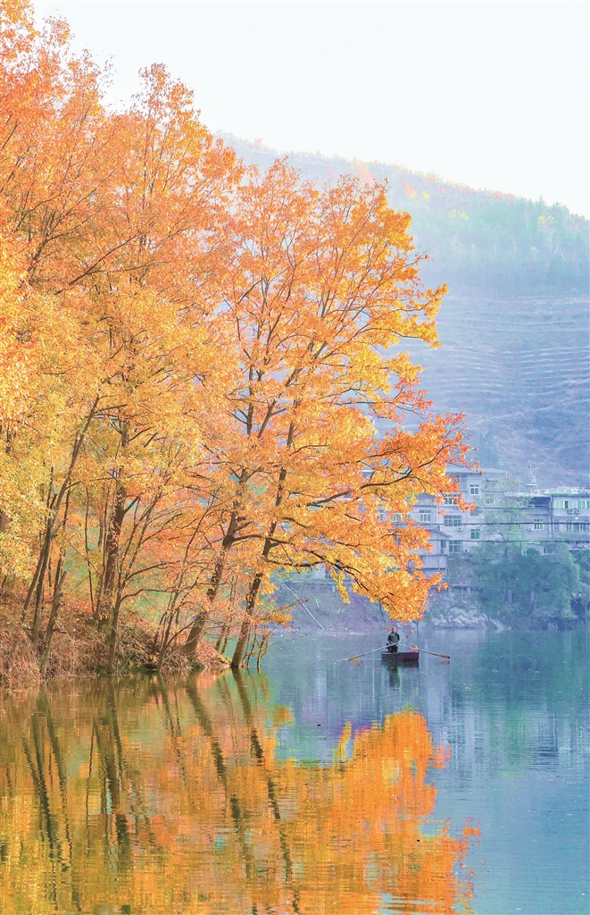 待到霧散天青,沙坪河便展露出它清澈的容顏。兩岸層林盡染,漫山的斑斕都被河水溫柔收納。一川碧水如鏡,完整復刻出天空與彩林的倒影,虛實交錯,舟行其上,仿佛滑入一幅靜止的油畫。山偎著水,水映著山,靜謐而又絢爛。