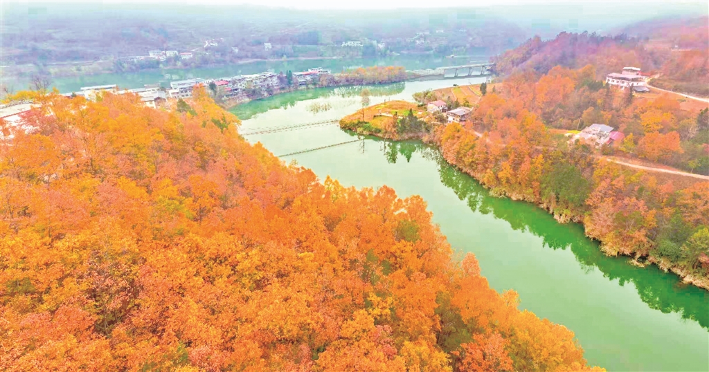 夕陽下的沙坪河,斑斕山林與澄澈水色繪就成一幅靈動的水鄉畫卷。郭浩 攝
