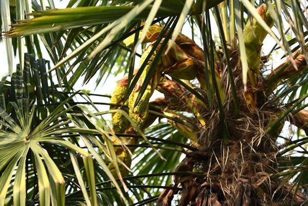 到了80年代初,當地時興起棕床,睡起來柔軟又有彈性,舒適又隔潮氣,家道殷實人家相繼都拆掉了稻谷草鋪就的架子床換成美觀新潮的棕床,后來我才知道,做一張床,除了木料和繩子,還得十幾塊工匠錢,記得父親在陡坡上搬樹摔了一跤腰部受損,天氣一變就不停地呻吟,姐姐便使喚我們割遍自留山的棕,勉強織了一張床,是夜,父親睡得很安穩。棕樹開的花也很有特點,花形呈佛手狀,花籽如粟米子樣金黃亮色,味道有點淡淡的苦,婆在世時常說棕樹花燉豬心,娃娃吃了補心肺,長記性,我上學時再生僻的詩文,看過一遍就爛熟于心,或許與吃過此湯不無關系,我在想,棕花入藥對治愈新冠肺炎應該療效不錯,它也是一副神奇的中藥方劑。