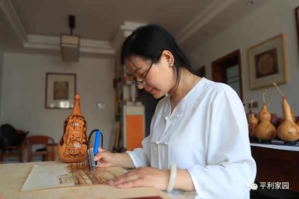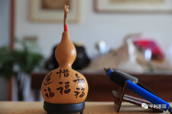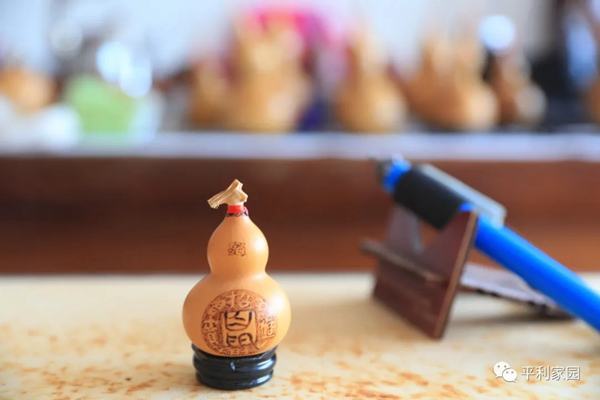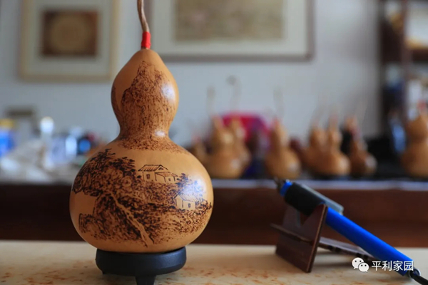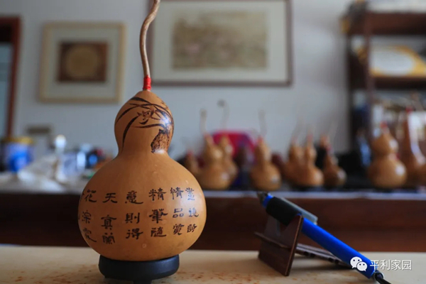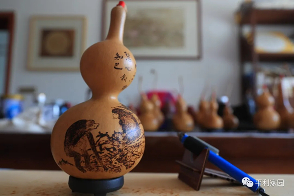 一組葫蘆,明黃里透出古色,熠熠生輝的畫幅里,平利雄山秀水滴滴溢出,一時間,香氣四溢,鄉風彌漫,整個房間便裝滿女媧故里平利的山山壑壑。