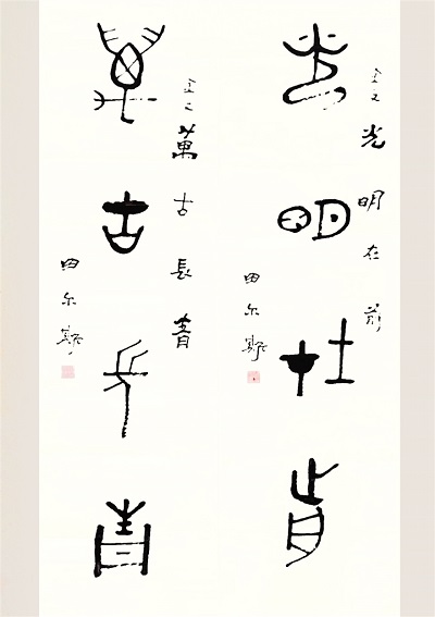 字如其人,古來一直有此一說,我每每觀之,總會想起元代馬致遠的散曲“枯藤老樹昏鴉,古道西風瘦馬”那樣的寫意。后期他突然對金文有了興趣,自己琢磨著寫起了金文。金文是繼甲骨文之后發展到第二階段的中國文字,是刻在銅器、鐘鼎上的,也屬于象形文字,時間上處于篆字和隸書之前。我開始不明白老師怎么轉型寫起這種字來了,也許是愛好、是喜歡吧,也許是一種永不渴止的新的追求,但這兩種字給人的美感享受,卻是懂與不懂書法的人都一致認可的。