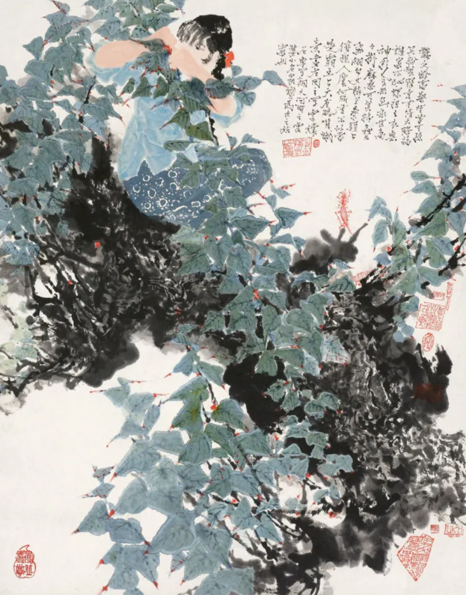 題識:蠶女齡喬桑,昔有王孫笑粉妝。羅素有情天降福,誰家不秘王祖。衣無神采食無魚,永世商裔掛麻桑。可笑棉蟲無飛翅,白女敢上桑顛上。俯視人寰何所有,不似當(dāng)(年)楚霸王。上天有路唯蛾素,畫者因之寫云。石魯寫朝天河畔之云婆,小名安蛾,為女之姑家也。《采桑圖》,2010春拍成交價1064萬元。
